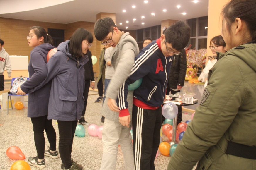 精彩的晚会节目欣赏过后,文艺部的干事们立即清理桌椅,将十个游戏场地迅速搭好,同学们则跃跃欲试,期待着即将开始的有趣的游戏环节。很快,厅内被分成了十个区域,最中间的桌子上放满零食糖果供同学们自取,其它则进行着你画我猜,踩气球,接乒乓球等丰富有趣的游戏活动,每通过一项活动即可获得一个通关印章,集满十个更有神秘奖励。如此“诱惑”引得同学们穿梭于各个场地,挑战各种游戏。场上气球的炸裂声,赢得游戏的欢呼声不绝于耳,而请文艺部部长唱歌,年级长跳舞等助兴的“大冒险”游戏引来阵阵笑声,思源楼多功能厅迎来了真正的疯狂。