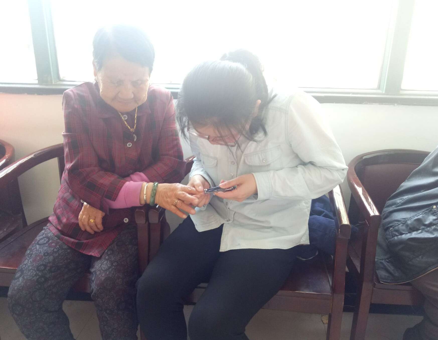 女生们细心的为老人剪指甲,老人不仅向志愿者讲起了年轻往事,仿佛他们还在我们的年纪,还关心志愿者的情况。志愿者们为他们唱起红歌逗得他们连连大笑。
