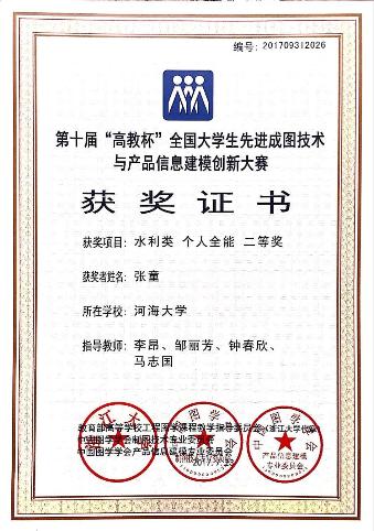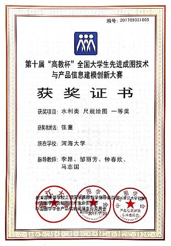 由教育部高等学校工程图学教学指导委员会和中国工程图学学会制图技术专业委员会联合举办的第十届“高教杯”全国大学生先进成图技术、产品信息建模创新大赛于2017年7月21日~24日在兰州交通大学举办。博彩网 2015级给排水科学与工程专业张童同学积极参与,经过选拔和培训,在港航院老师的指导下,荣获水利类尺规绘图一等奖,水利类个人全能二等奖以及水利类团体一等奖的好成绩。