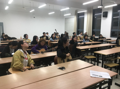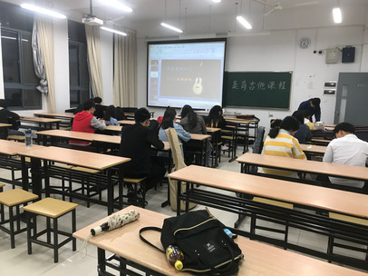 由于许多同学可能是第一次接触吉他,老师便从吉他的分类开始讲起,为了让一些新手能够买到适合自己的吉他,老师还特意介绍了吉他的品牌和一些选购吉他的小知识。同学们都在聚精会神地听着。接下来,老师开始介绍吉他的弹奏和指法,并给同学们做起示范,教室里响起一阵阵琴弦拨动的声音,同学们开始尝试弹奏,期间,老师又一个个地为同学纠正指法,防止同学们在学习中出错。