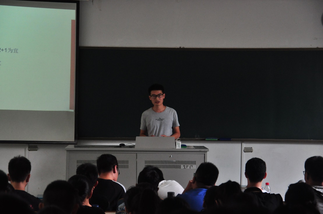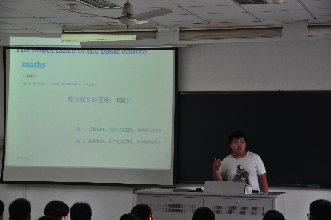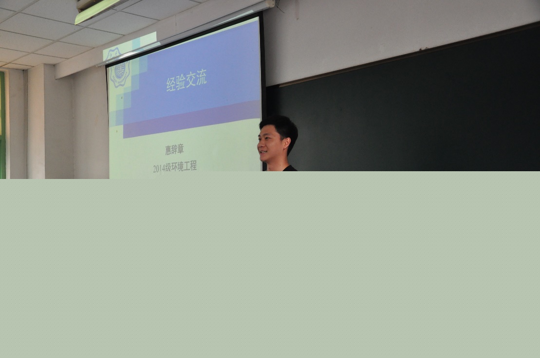 接着向大家分享经验的是惠辞章学长,他向大家着重介绍的是考研、保研方面的经验。他希望同学们能够主动了解参与各种学科竞赛、挑战杯、活动等,课余参加公益志愿,提高自身综合能力。
