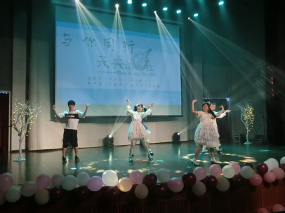 在全场同学的欢呼声中,来自河海天央动漫社宅舞部的同学开始了他们的舞蹈——“与你同行”。整齐划一的动作,变幻有序的队形,灵动活跃的音乐,他们的表演为全场师生献上一场视听盛宴。“每一个不曾起舞的日子都是对生命的辜负”,他们用自己的舞姿诠释着歌词“让这节奏化为力量,向伟大远方乘风破浪”,展现着2018级环境新生积极向上,勇立潮头的风采。