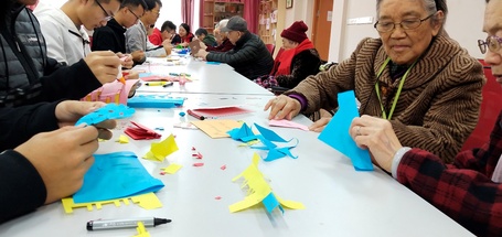 在负责人的带领下,大家摆放好了座椅和手工道具。待老人入座后,志愿者们也纷纷就座并开始和老人们一起制作手工贺卡。刚开始大家还有些生疏,但在观看了相关教学视频以及创意图片后,大家的想法便如同雨后春笋一般冒出。一些志愿者们还巧妙运用了剪纸的技巧,做出了别出心裁的贺卡。