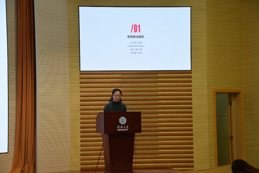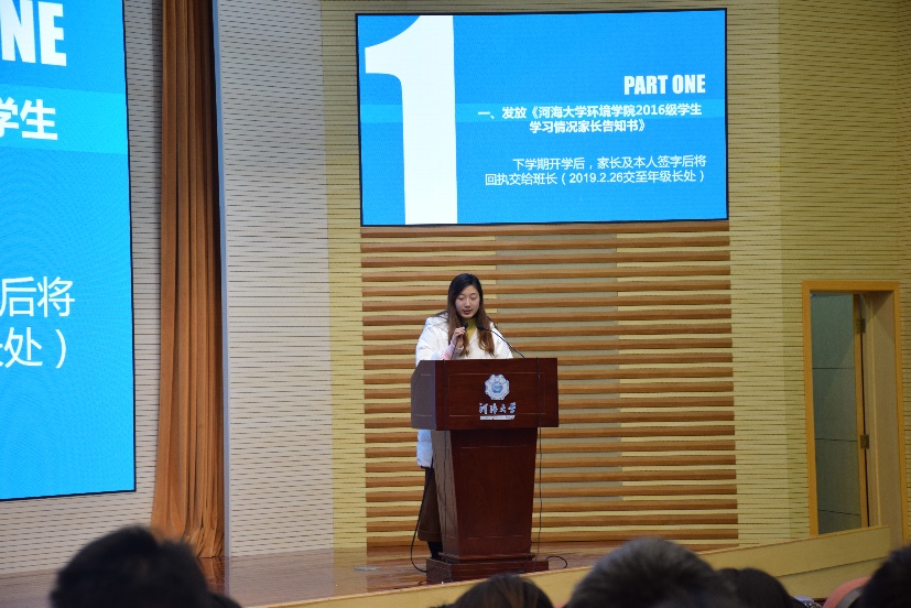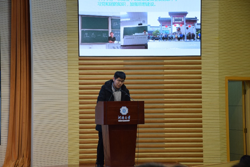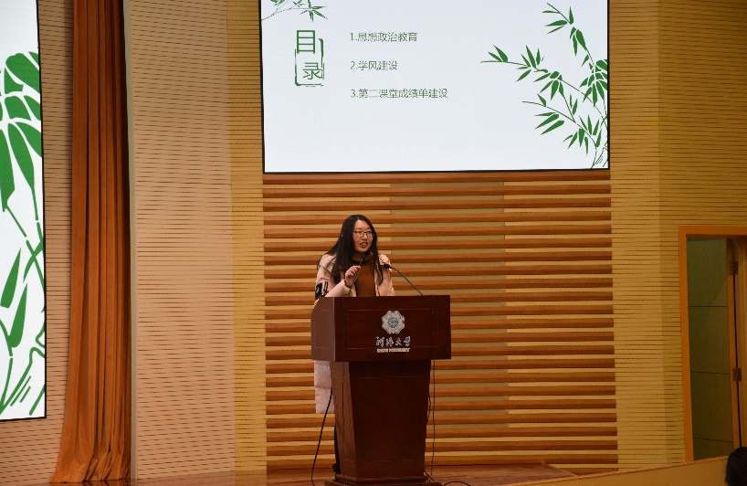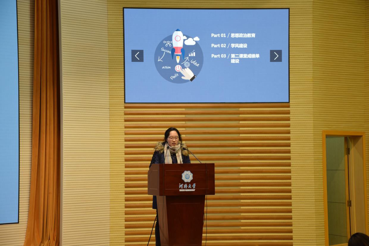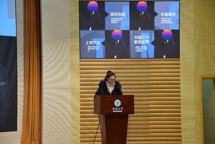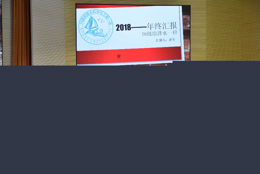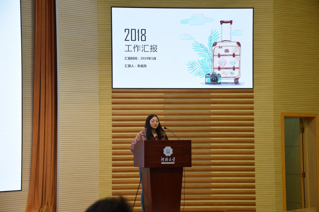 第二项内容是学生干部汇报。首先是党支部进行述职报告,接下来是各年级委员从年度工作总结、问题改进、2019计划等方面进行汇报,最后是各班班长从思想建设、学风建设、文化建设、PU第二课堂成绩单建设等方面对本班情况进行概括总结,并提出了2019年的相关计划。
