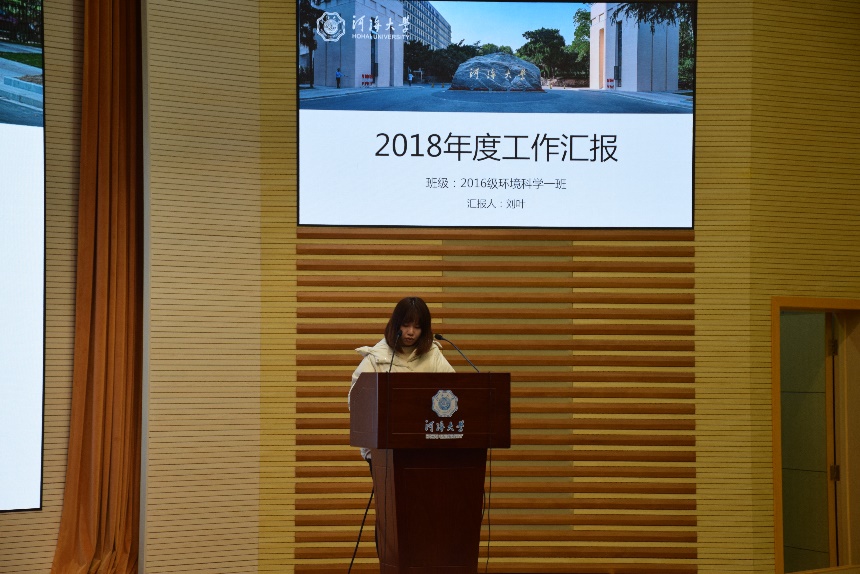 (左图为环境一班班长魏尧同学进行汇报,右图为环科一班班长刘叶同学进行班级事务汇报)