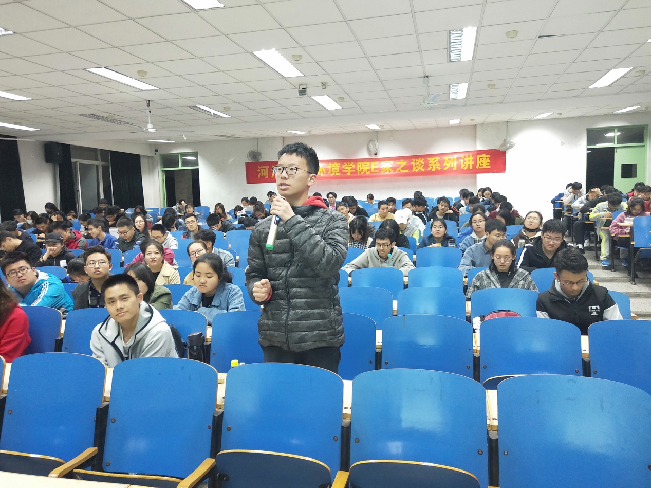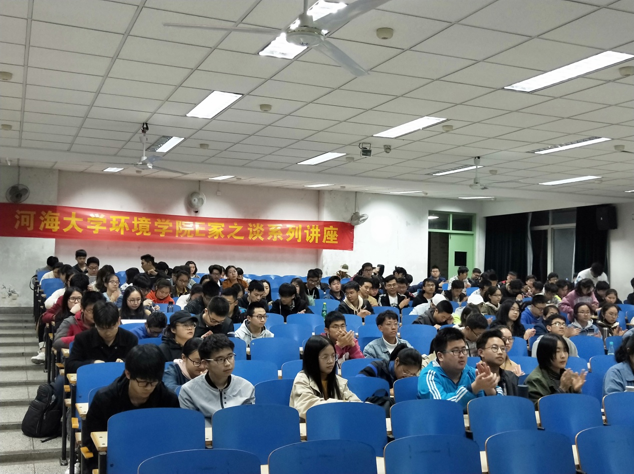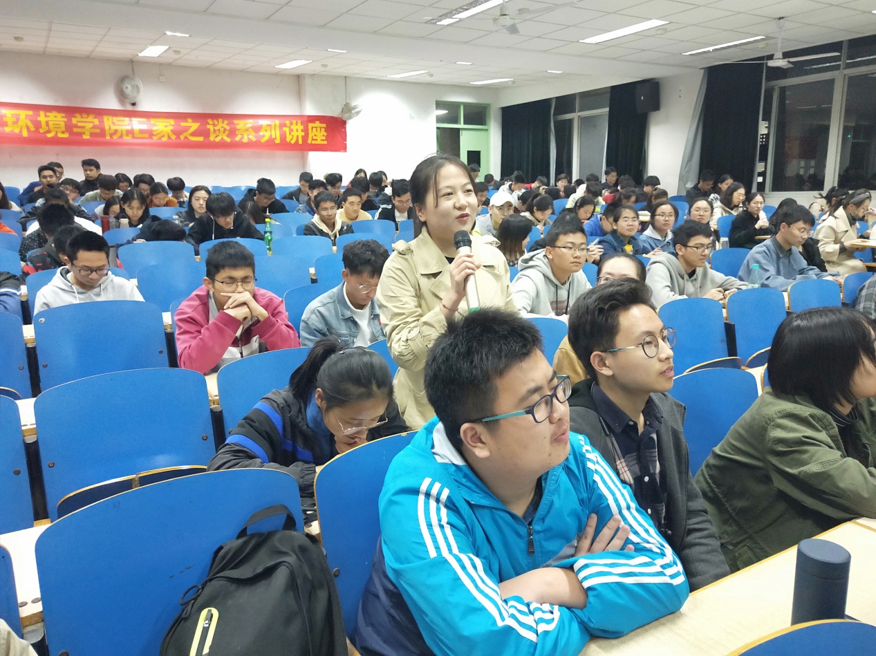 而后,e家之谈正式开始。白雪教授首先从纳米污染物环境行为、新兴污染物环境检测、典型污染物催化降解三方面为同学们展现了近年来她所带领的团队的研究内容与研究成果。为了帮助目前还未接触到专业知识的同学们加深理解,白雪教授在PPT中选用了大量形象风趣的讲解图,并在阐述专业知识后用贴近日常生活的语言进行二次描述,使乏味的化学公式与理论知识变得生动具体。