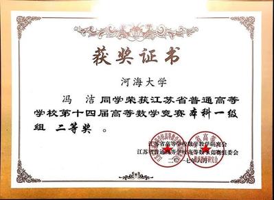 利用课余时间积极参加各项学科竞赛,先后获得:江苏省普通高等学校第十四届高等数学竞赛本科一级组二等奖、第九届全国大学生数学竞赛(非数学类)江苏赛区三等奖、2018年第十五届五一数学建模竞赛三等奖等。