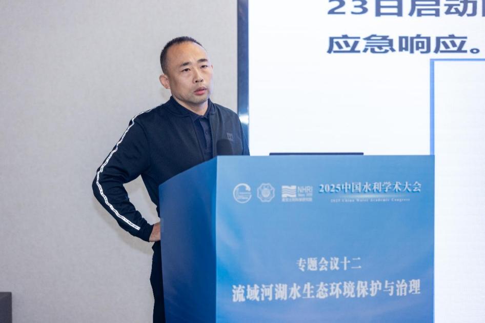 中国南水北调集团中线有限公司水质与环保中心主任常志兵作“丹江口库区及总干渠2025年蓝藻异常增殖原因分析与应对”的报告,介绍了南水北调中线工程通过实施人工造峰调度等多项措施,成功处置丹江口水库低水位引发的蓝藻异常增殖事件。