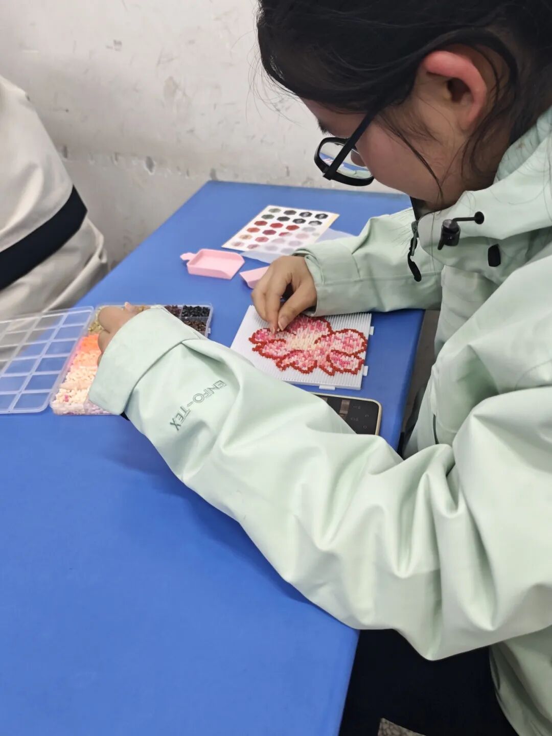 在轻柔的春日背景音乐中,创作环节正式开始,大家纷纷挑选自己心仪的拼豆,神情专注地投入创作。镊子在指尖轻舞,一颗颗细小的彩色拼豆被精准地放置在拼豆板上,从无到有,由点及面。